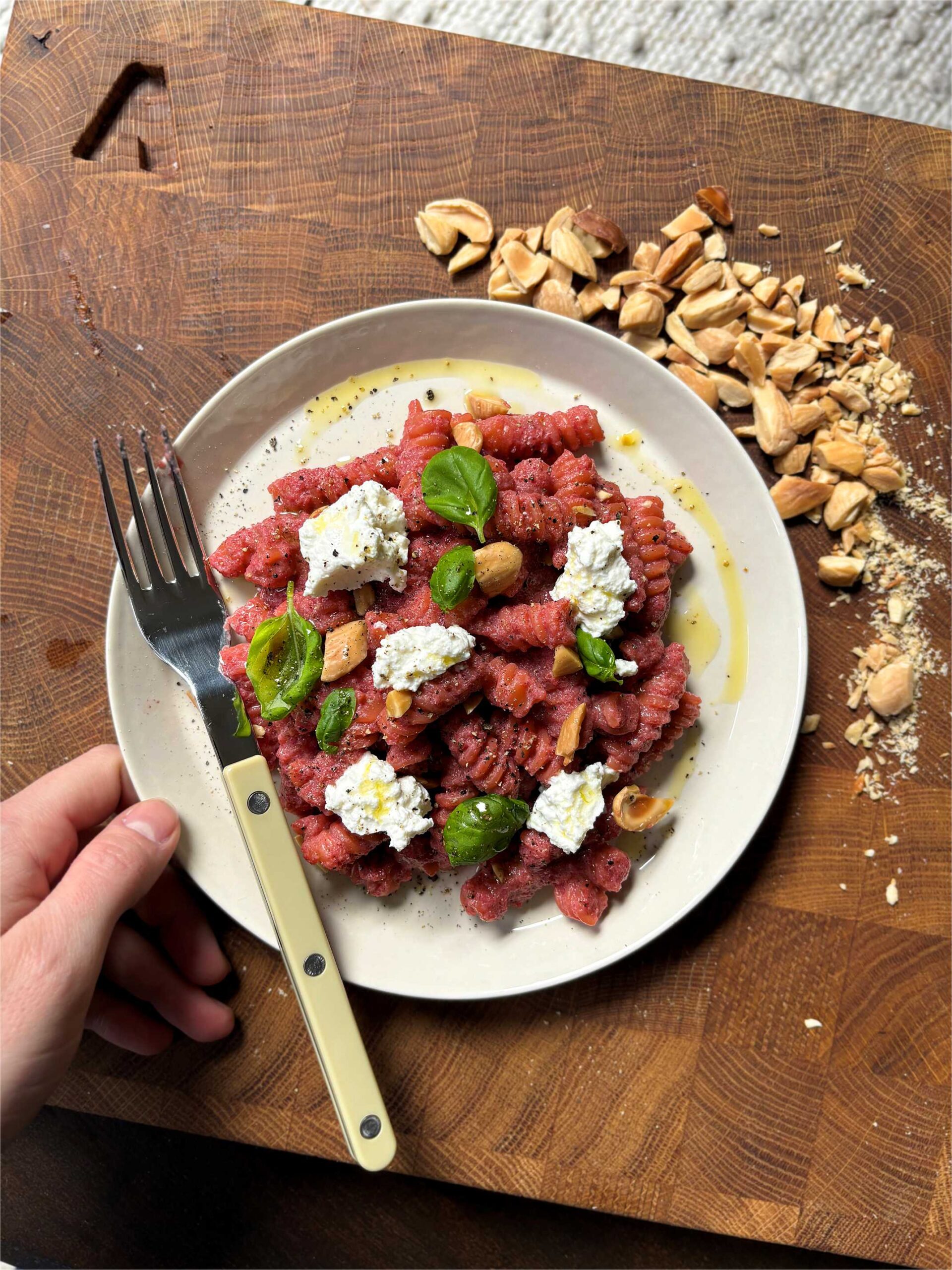 Bietenpasta met ricotta en amandel