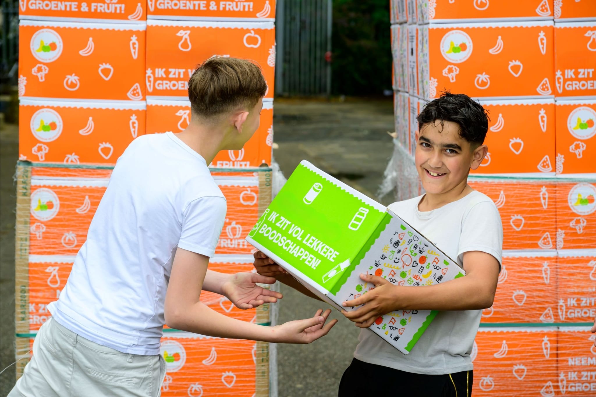 Een doos vol verse groente en fruit voor een gezonde start van de zomervakantie.