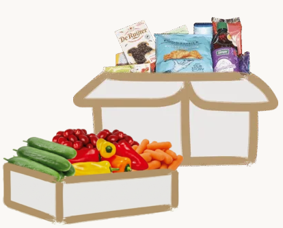 - Bevat een blije mix van houdbare producten, verse groente en wat lekkers.